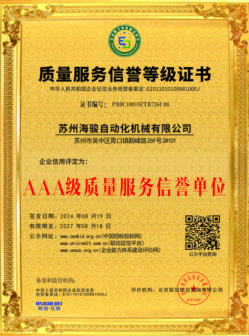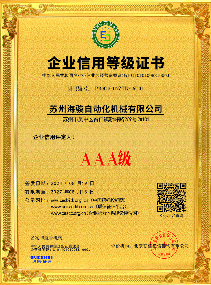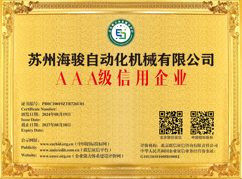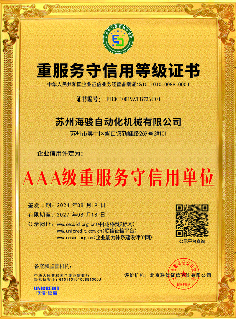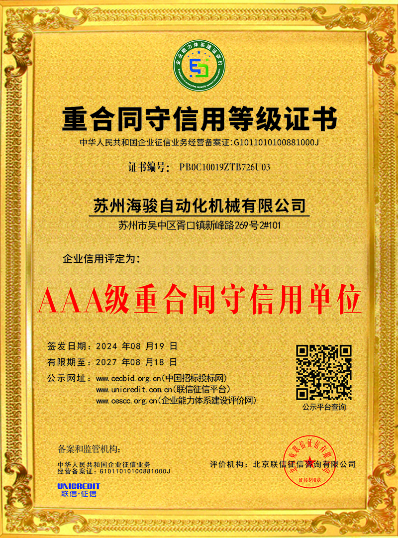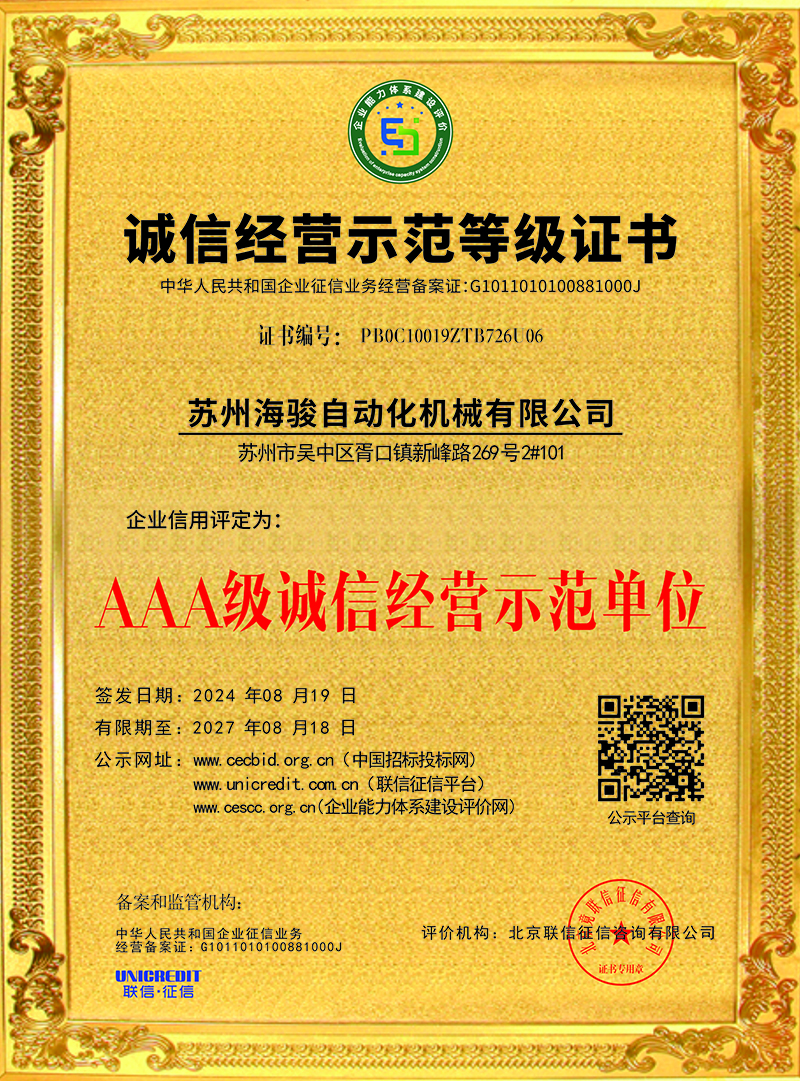 蘇州海駿自動化機械有限公司的誠信、實力和產品品質質量獲得了業界的認可!同時也被工商部門評為 “重合同、守信用”單位,歡迎各界朋友蒞臨蘇州海駿自動化機械有限公司參觀指導和業務洽談。