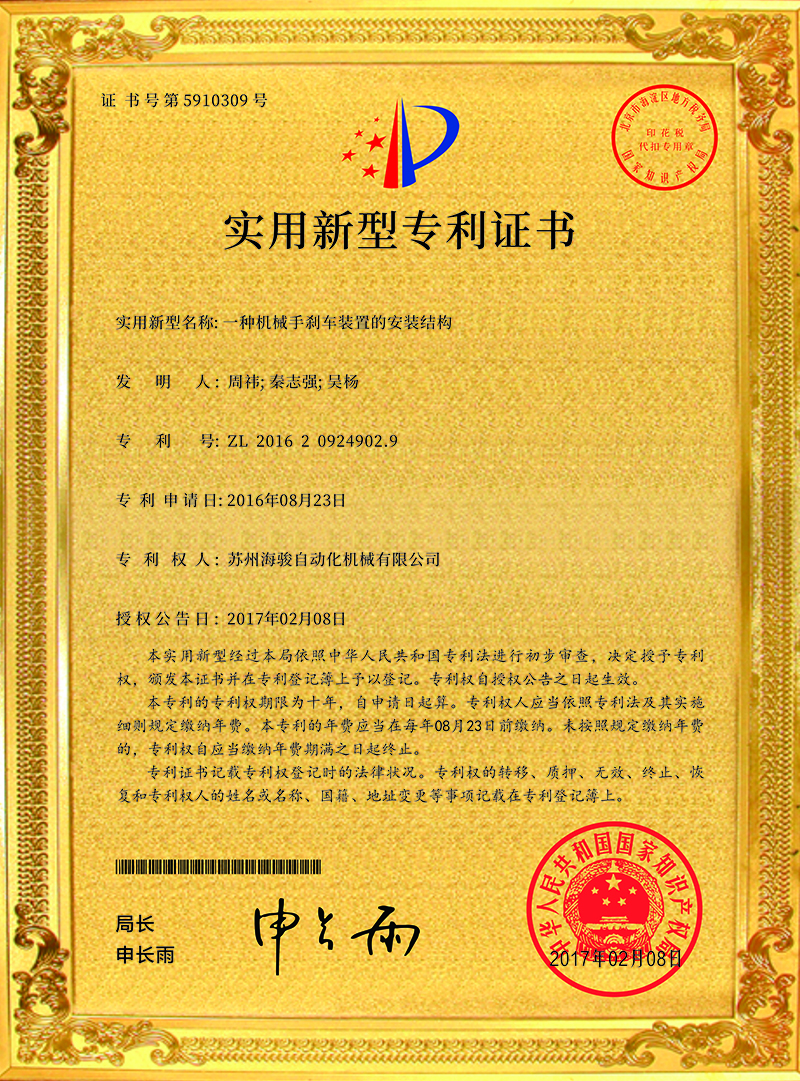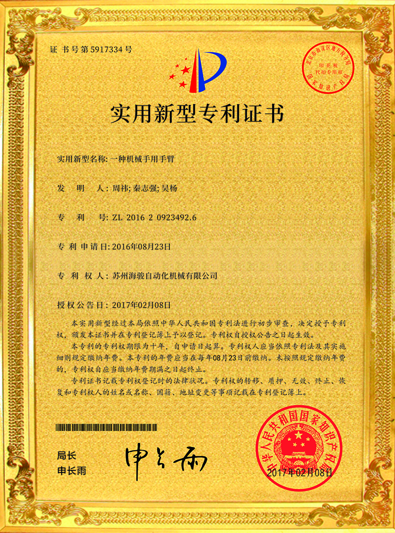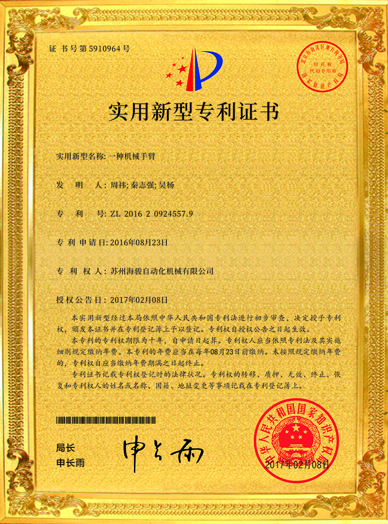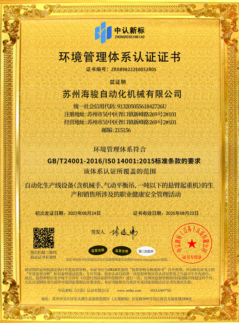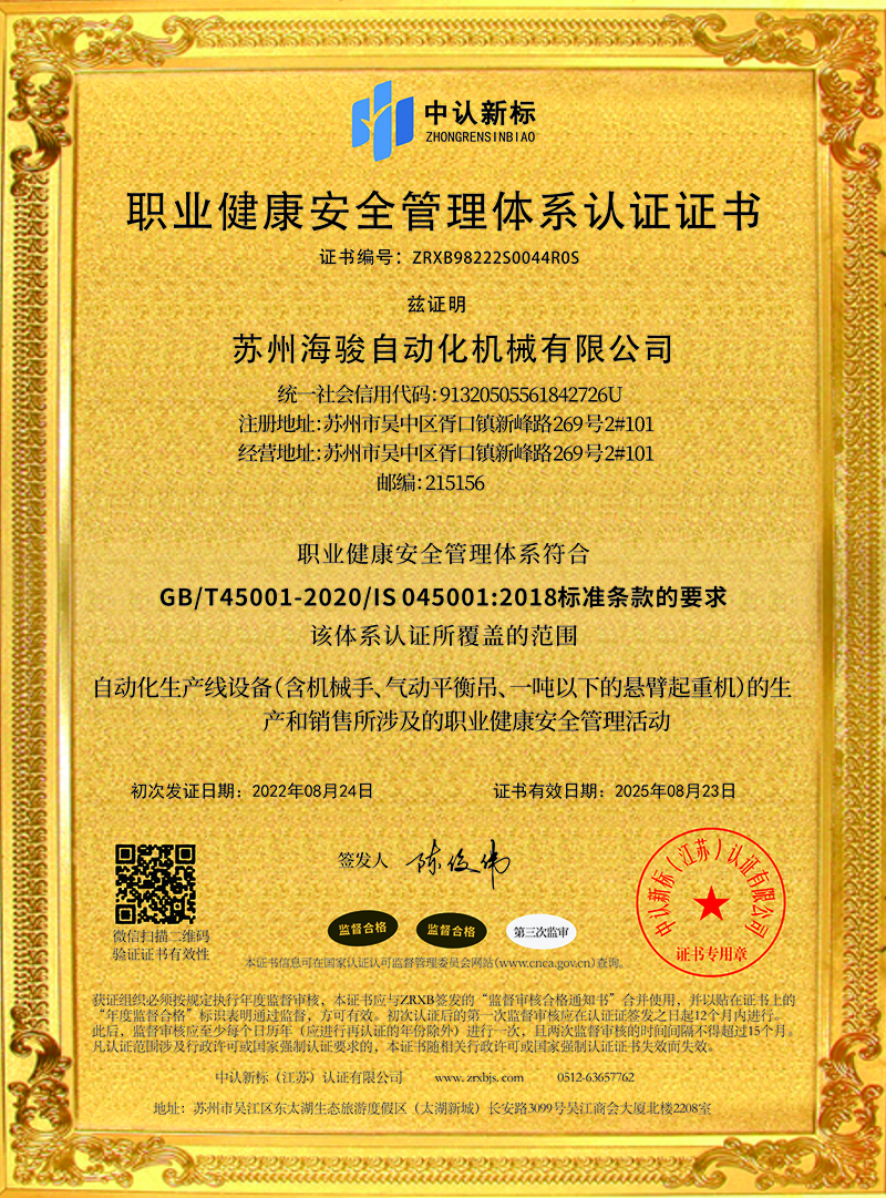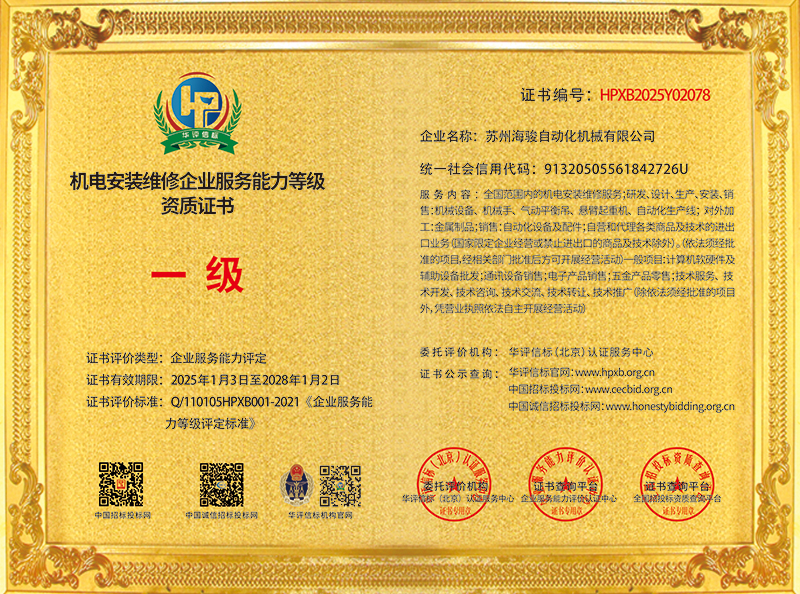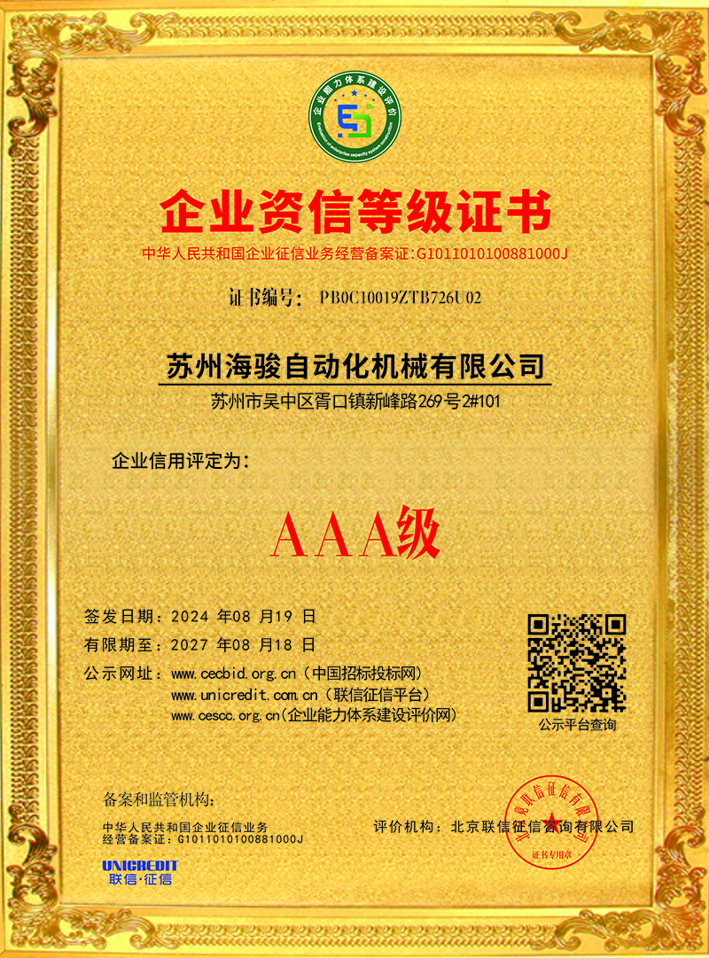 蘇州海駿自動化機械有限公司的誠信、實力和產品品質質量獲得了業界的認可!同時也被工商部門評為 “重合同、守信用”單位,歡迎各界朋友蒞臨蘇州海駿自動化機械有限公司參觀指導和業務洽談。